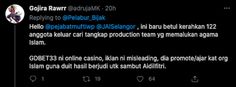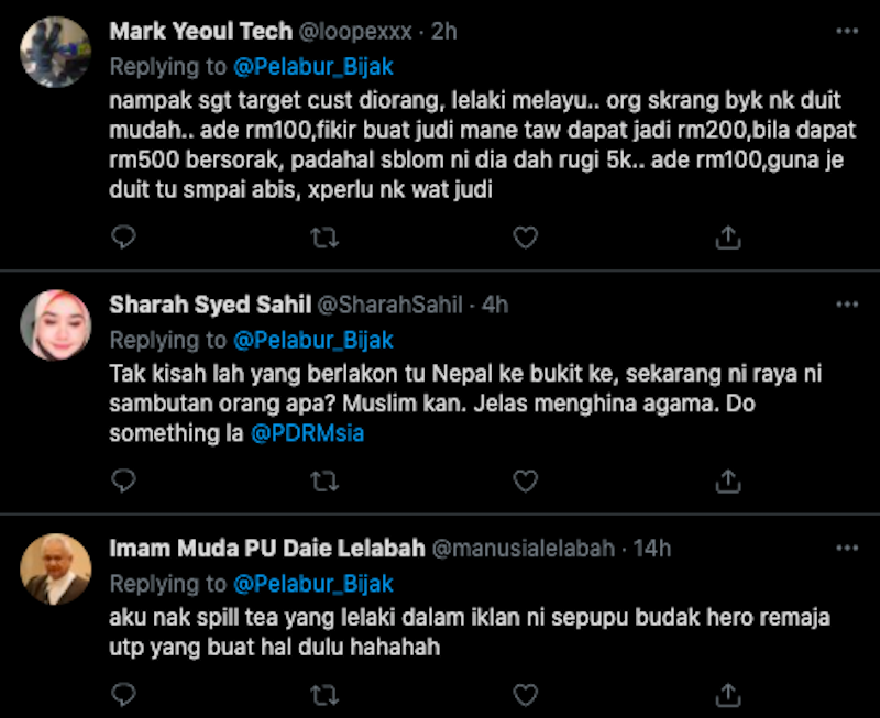 Sejak semalam, sebuah iklan mempromosikan aktiviti perjudian yang bertemakan sambutan Hari Raya Aidilfitri tular di media sosial sehingga mengundang kecaman netizen.