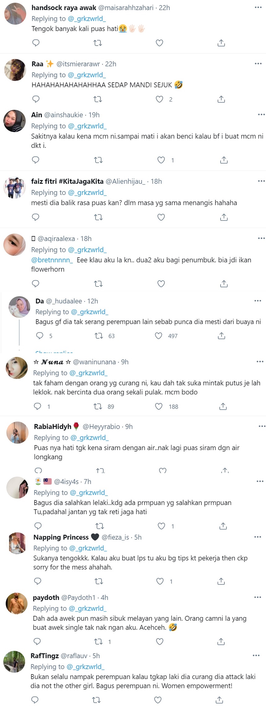 Video tersebut turut tular di Twitter dan mendapat pelbagai reaksi daripada netizen berpuas hati dengan tindakan wanita itu. Malah, ada yang mengatakan ini barulah tindakan dengan menyerang lelaki terlebih dahulu.