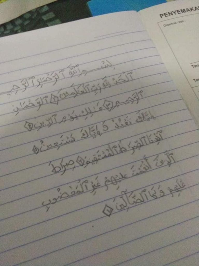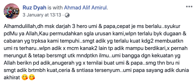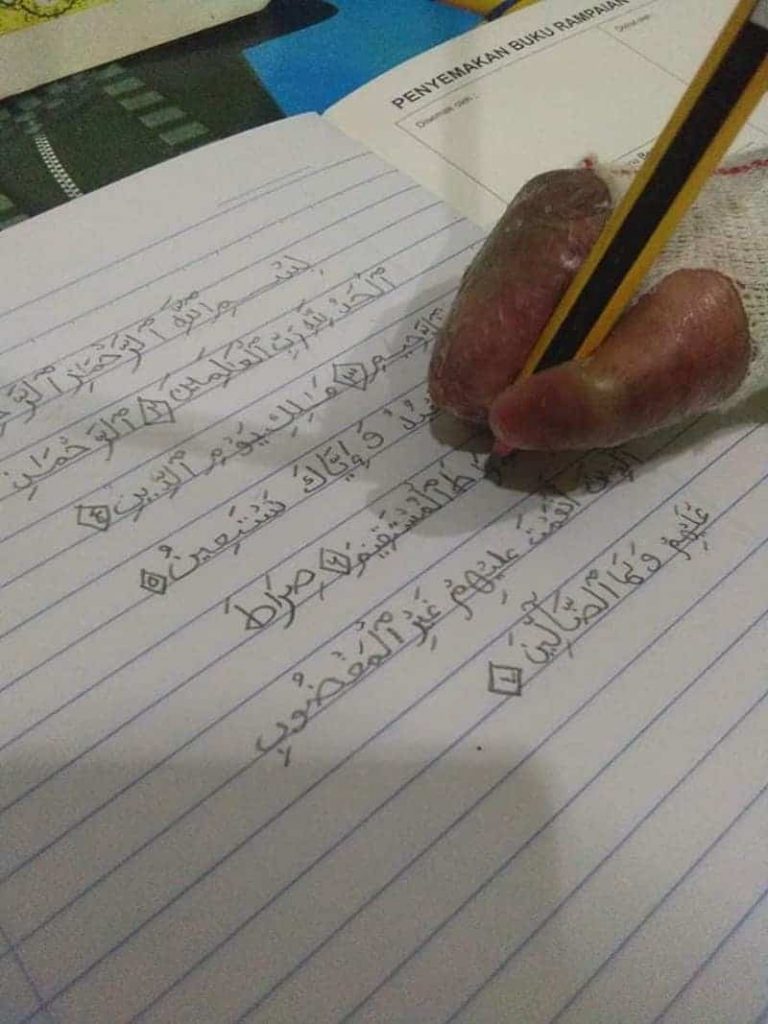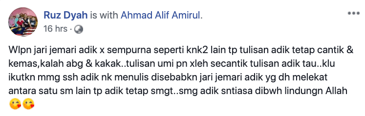 Menerusi perkongsian di Facebook ibunya, Ruz Dyah, meluahkan rasa bangga dengan kemampuan anaknya itu. Meskipun jari jemarinya tidak sempurna, tetapi anak itu mampu untuk menulis ayat Al-Quran dengan baik dan cantik sekali.