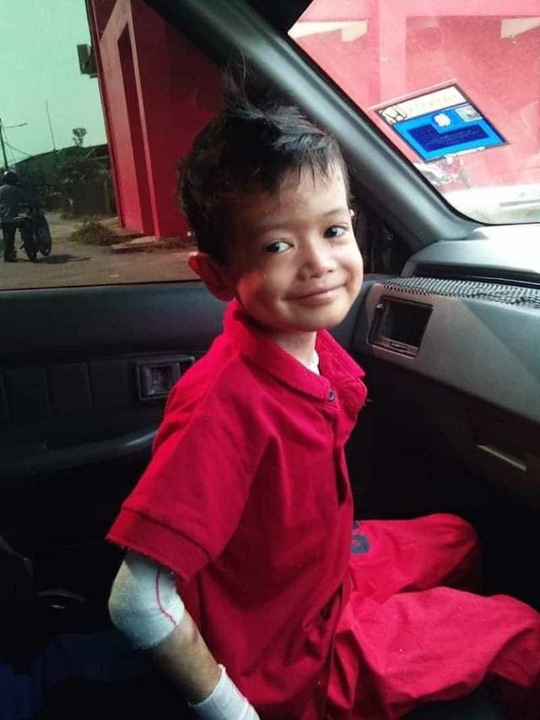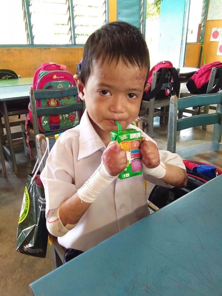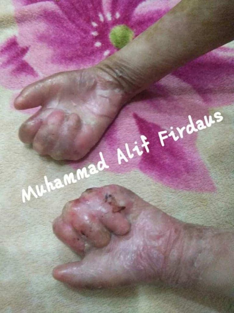 Disebabkan penyakit itu, jari jemari adik Alif tidak terbentuk dengan sempurna, dengan keadaan kulitnya yang mengelupas dan kemerah-merahan.