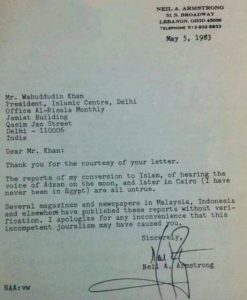 Dalam surat tersebut, Neil Armstrong memaklumkan bahawa gosip yang menyatakan bahawa sudah memeluk agama Islam selepas mendengar azan di Bulan dan Cairo, Egypt adalah tidak benar sama sekali.