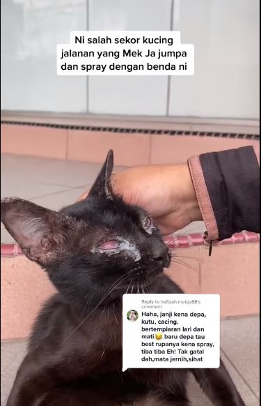 Seorang manusia yang prihatin. Menolong kucing yang sakit mata. Yelah mana tak kesian. Dia bukan boleh letak ubat sendiri pun. Akak tu menolong kucing yang sakit mata. Semoga Allah dapat membalas jasa akak ni sangat baik sanggup menolong kucing jalanan yang sakit mata. Selepas spray kat mata kucing, berlari- lari kucing tu