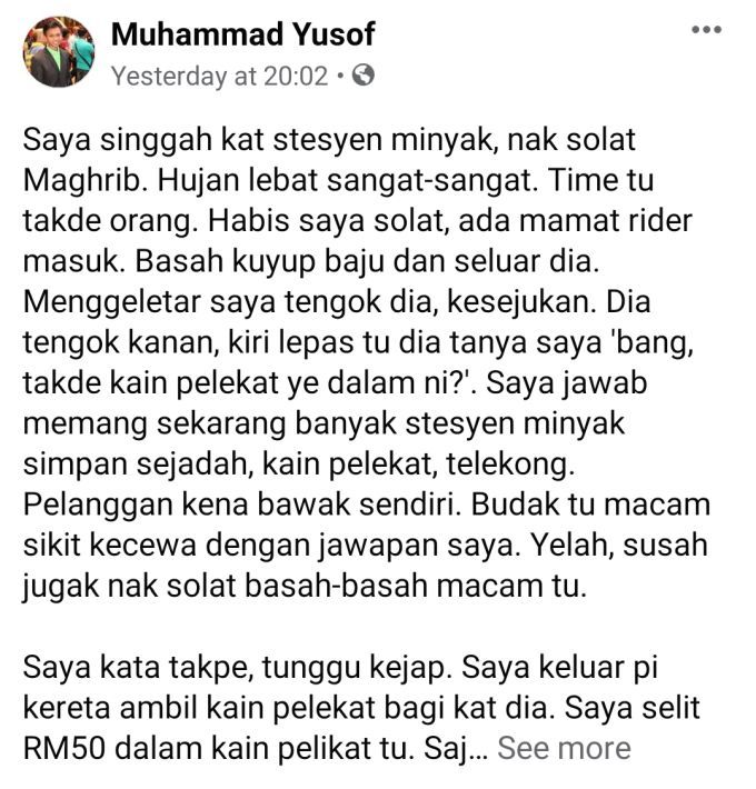 “Saya jawab memang sekarang banyak stesen minyak simpan sejadah, kain pelikat dan telekung. Pelanggan kena bawa sendiri,” tulisnya menerusi halaman Facebook bernama Muhammad Yusof.