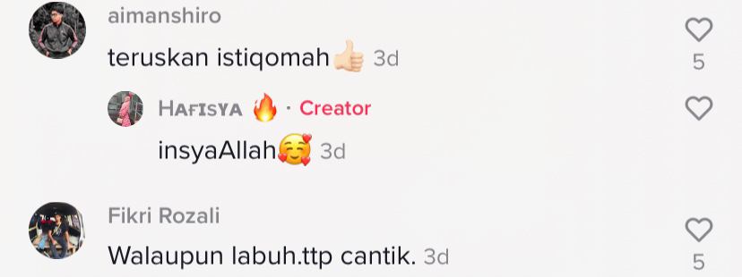 Selepas video tersebut tul4r dan mendapat perhatian ramai, Hafisya dihujani banyak sokongan positif dan malah, ada yang mula menutup aurat sepenuhnya selepas follow dia di TikTok.