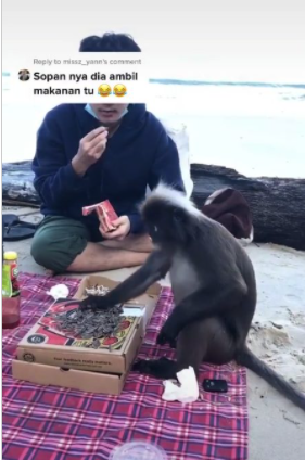 Namun apa yang mencvri perhatian ramai adalah kemunculan seekor monyet yang turut sama sertai perkelahan tepi pantai itu. Bukan itu sahaja, haiwan ini siap duduk makan kuaci dengan mereka lagi!